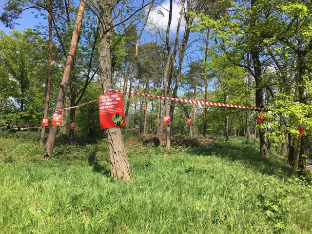 Um wenigstens den Flächenverbrauch sichtbar zu machen, ist es temporär mit Plakaten und Flatterband markiert. Schau selbst – am besten vor Ort – im Wäldchen am S-Bahnhof MesseSüd (Eichkamp):