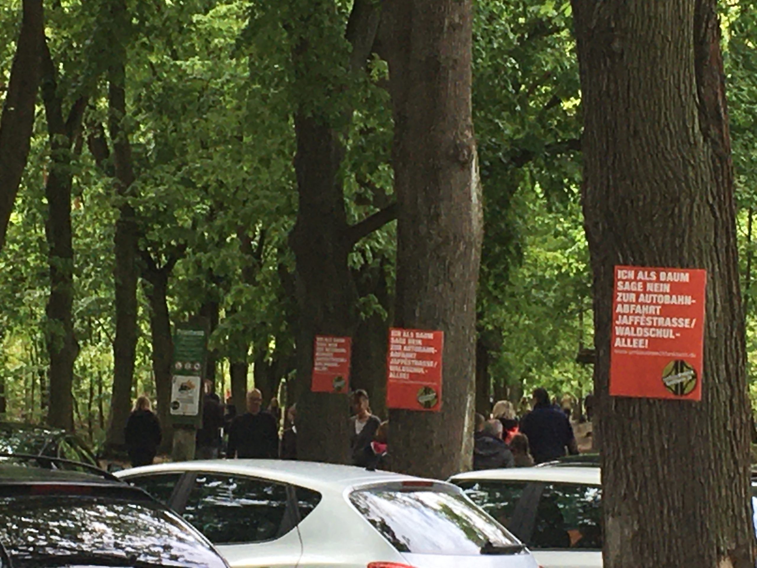 Heute am S-Bahnhof Grunewald haben sie sich Plakate um den Stamm gebunden und beziehen Stellung: