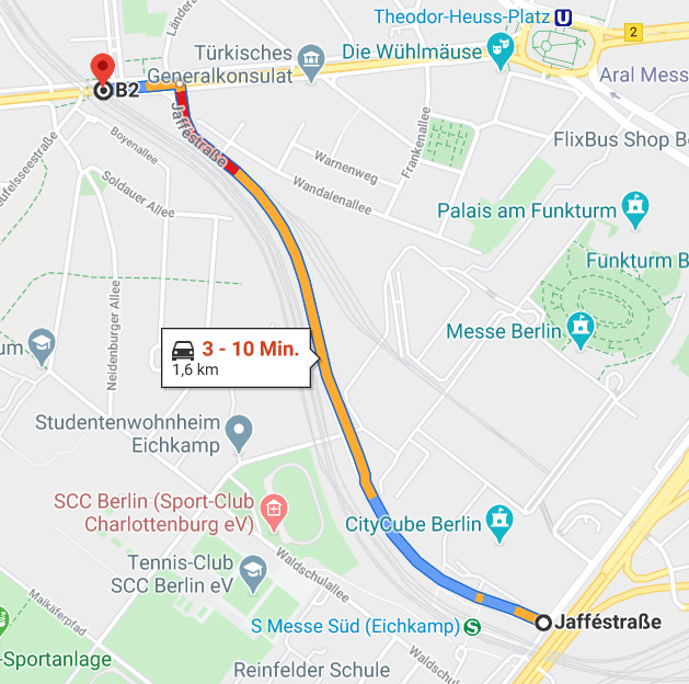 Die Waldschulallee / Neidenburger Allee bildet eine parallele Straßenführung zur Jafféstr./ Heerstraße im Bereich zwischen der geplanten Ausfahrt und dem S-Bahnhof Heerstraße. Schon bei der jetzigen Verkehrsführung wird diese Route bei stärkerem Verkehr viel genutzt. Bei einer Verdopplung des Verkehrs auf der Jafféstraße wird diese Nutzung automatisch zunehmen. Die Simulation der DEGES berechnet aber einen identischen Verkehr auf der auf der Waldschulallee für beide Szenarien. Das widerspricht jeder Erfahrung. Ähnlich unrealistisch niedrige Verkehrszahlen ergeben sich für die Eichkampstraße, Platanenallee, Königsallee u.v.m
